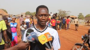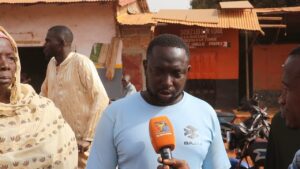 « nous sommes sortis ce matin parceque toute la population est fatiguée, cela fait maintenant 3 ans que cette route est ainsi , quand vous venez ici le soir les conducteurs ne se voient même pas il faut allumer la phare, donc nous sommes sortis pour cela que le gouvernement nous vienne en aide , nous voulons une route maintenant ».